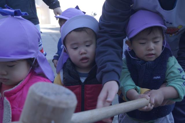 今日はおもちつき大会が行われました!あひる組のお友達は幼児組さんがお餅をつく姿を見て、「すごいね」や「おもちだね」等の言葉が聞かれ力強くお餅をつく姿に見とれていました(⌒∇⌒)その後、数名のお友達は保育者と一緒におもちつきを体験しました♪重い杵を持ち、一回一回力強くお餅をついていました。お米から段々とお餅になっていく様を見て、とても不思議そうに眺めていました(^^♪