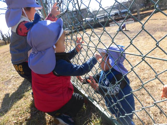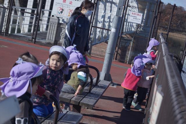 お散歩ロープを使って行きましたが、東大和公園に着くとロープから手を放し、保育者のお話をしっかりと聞きながら楽しそうに歩いていました!