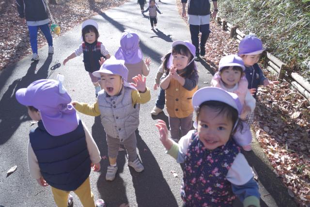 1組は狭山公園へ、2組は近所の遊歩道にお散歩に行きました。狭山公園までの道のりは大人でも息が上がる程でしたが、子ども達は元気いっぱい!ワイワイと楽しそうな声を響かせながらお散歩することが出来ました!