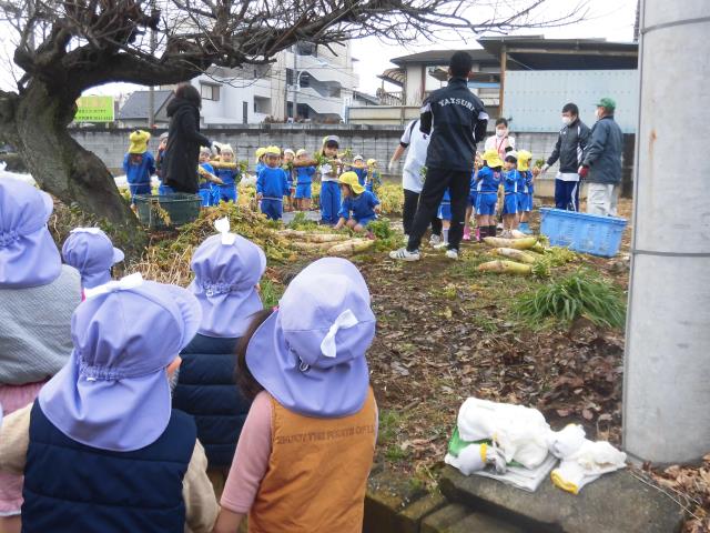 今日は、あひる一組のお友達は幼児組さんの大根抜きの様子を見学しに行きました!間近で大きな大根を見て「おっきい!!」と驚くお友達が見られ、また丸い大根を見ると、「おおきなかぶだね」というお友達が見られましたよ♪畑までは、お友達同士で手を繋いで行きました!お友達同士で声を掛け合いながら歩く姿は成長を感じました(´ω`*)