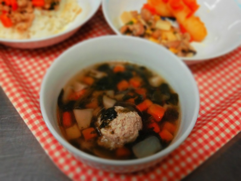 きくらげやチンゲン菜、白菜などの具材をたくさん入れ、桜エビで味付けをして、谷里保育園流にアレンジしました!