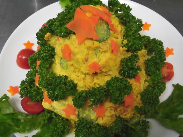 今年最後の給食はカレーライス、かきたま汁、バンバンジーサラダ、カボチャのグリル、ブロッコリー、みかんでした。