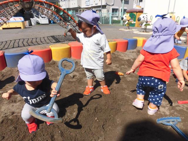 あひる組では砂場が大好きで、自分たちでアンパンマンの砂場倉庫を開けてシャベルや砂場の型抜きなどを出して遊んでいました。