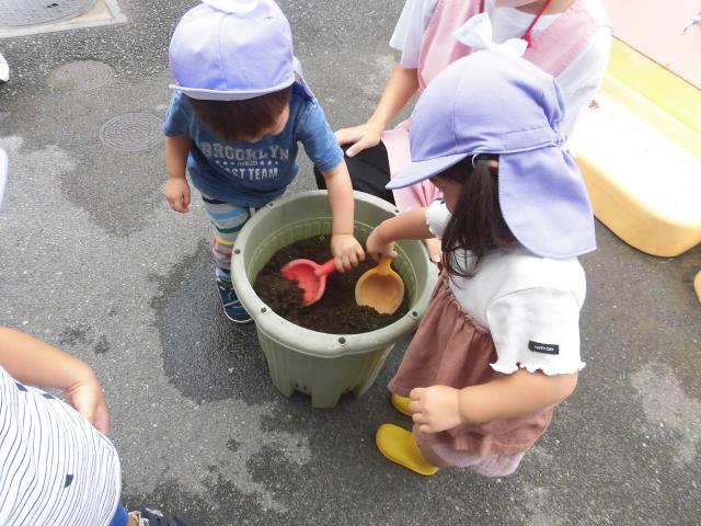 涼しい日が続いていますね。今日はあひる一組のお友達はオクラの種をみんなで植えました!シャベルで土を柔らかくし、その後に指で穴を開けて種を植えました☆彡子ども達は興味津々でオクラの種を植えていましたよ(o^―^o)二組のお友達はお部屋で絵本の読み聞かせのDVDを見ました!!お部屋を暗くして映画館の様にして楽しみました☆