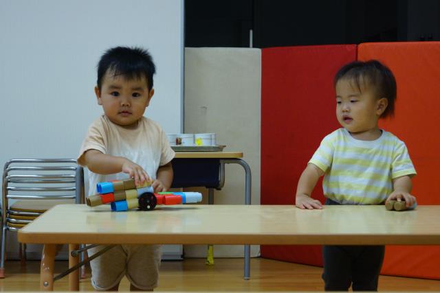 同じクラスのお友達だけでなく、お兄さんお姉さんに玩具を渡そうとする等、積極的に関わろうとする姿に成長を感じます。