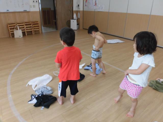 今日は子供達に、【暑い日の過ごし方】として水分補給のこと、着替えのこと、休息のことなどをもう一度話しました。子供達に質問しながら聞くと、「自分でお茶を飲む」「汗をかいたら自分から着替えをする」と以前にお話ししたことをよく覚えていて言ってくれました‼‼汗をかきながらも全力で活動に取り組んでいる子供達です☆子供は暑さにも強いですね(^^♪※明日はプール活動があります。ご用意宜しくお願い致します