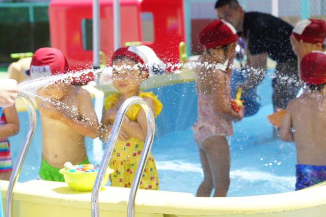 プール遊びではキラキラ光るプールの水を見て楽しんでいましたよ(^▽^)暑い中のプール遊びはみんな気持ちよさそうでした!