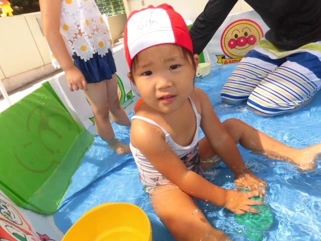 今日は、2組の水遊びの日でした。暑かったのでとっても気持ち良さそうでしたよ。まだまだ苦手なお友達もいますが・・・楽しんでいるお友達が多かったです。1組のお友達も同じお部屋で過ごしていて、2組が入っているのを見に来ていたので、少しですが一緒に水に触れて遊んでいましたよ。ラッキーでした(^^♪