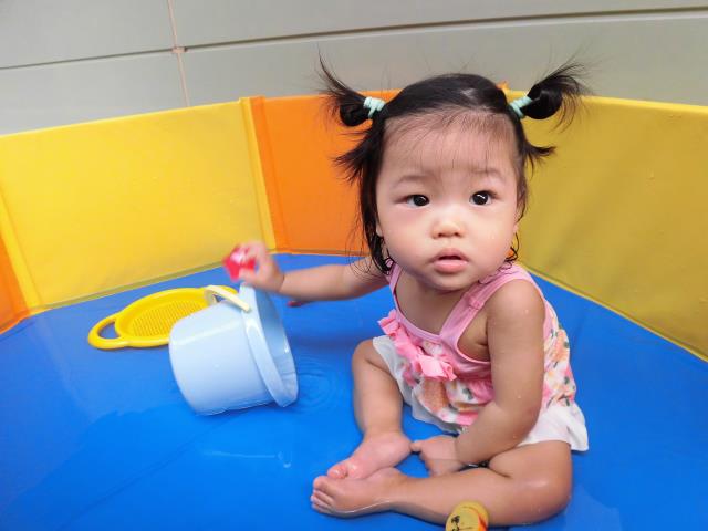 今日は、プール遊びと室内遊びをしました。プールでは、だんだん水に慣れてきて、バケツに水を入れて、自分からバケツに入っている水を身体にかけたりして遊んでいましたよ!