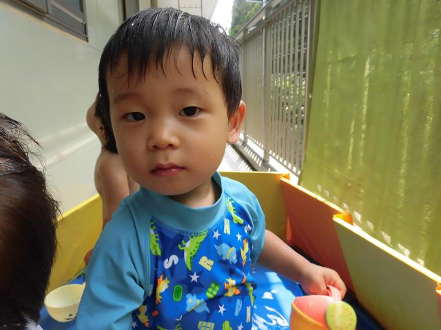 午後の大雨と雷には驚きましたね!午前中は晴れていたのでプール遊びを楽しむことが出来ましたよ。玩具を掴んでは投げたり、水鉄砲には手を差し出し水圧の強さを感じているようでした。