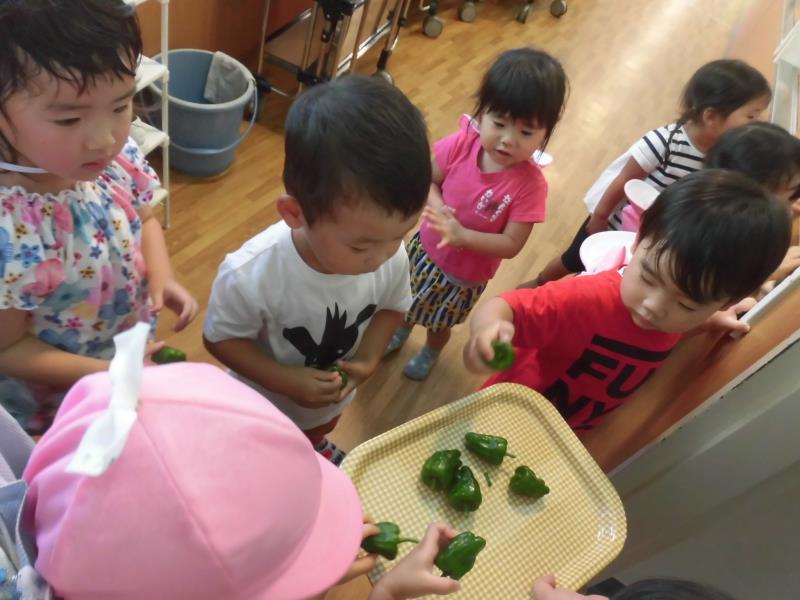 夏野菜をとったり、水遊びをしたり、カブトムシを見たりと、夏を感じることが出来ました(^^♪