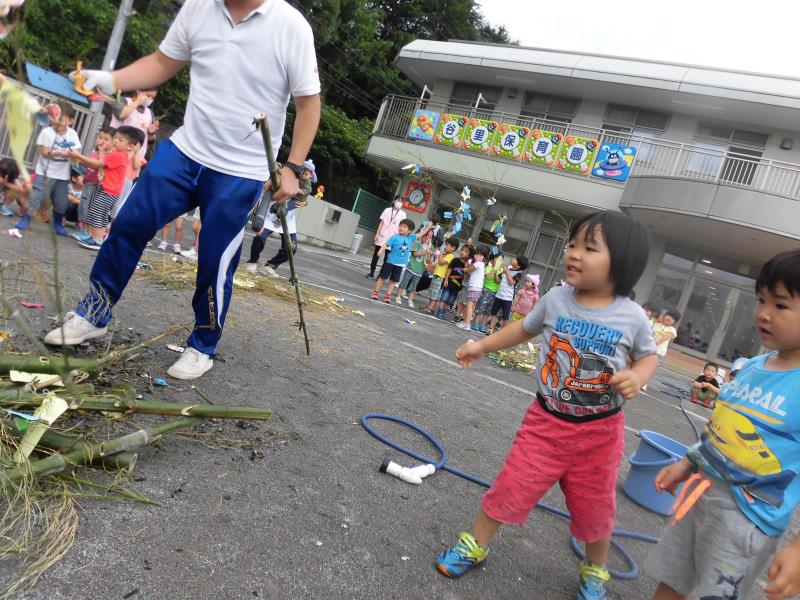 雨上がりの少しの時間でしたが、子ども達には七夕流しの意味をきちんと伝え、行事を味わう事が出来ました。七夕の笹をお持ちになって頂いた方、ご協力ありがとうございました。