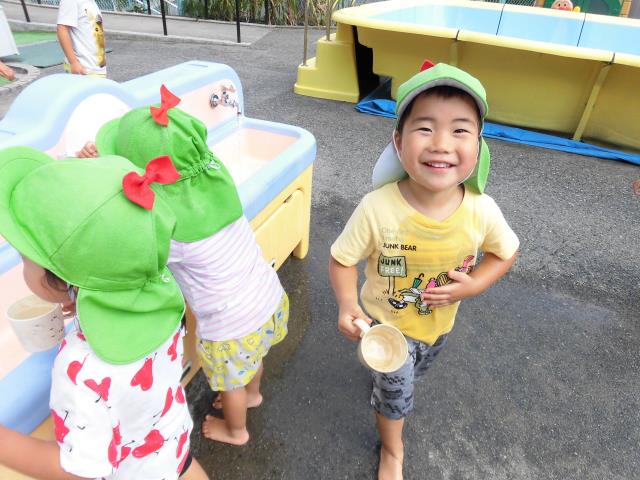 お水を使って砂場でお料理を作ってくれたり、保育者に水をかけられておおはしゃぎの子もいました(^O^)