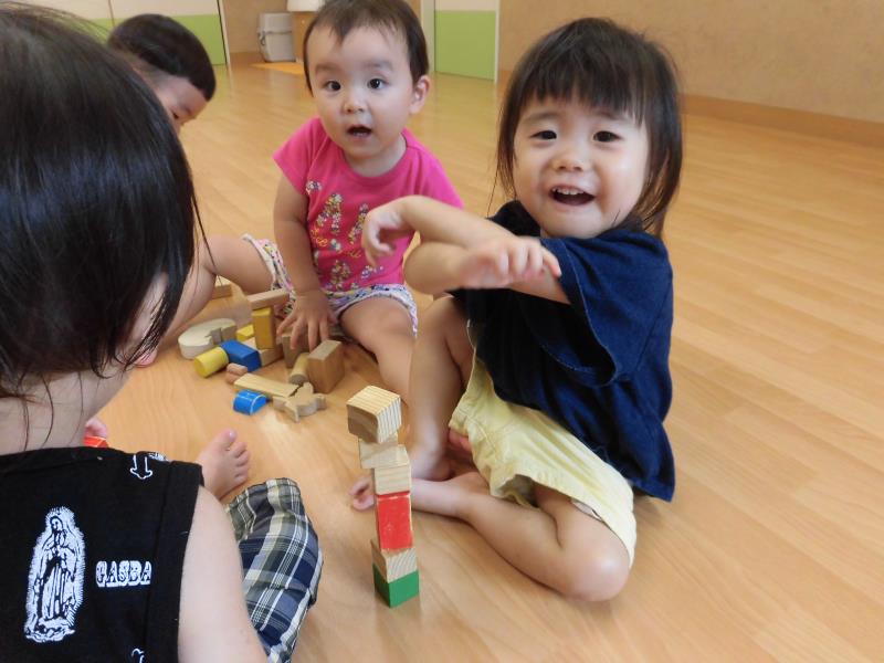 お部屋ではお友達と積み木を重ねて遊んでいました!集中して話しかけても聞こえていませんでした♪顔が真剣で可愛いですね!!