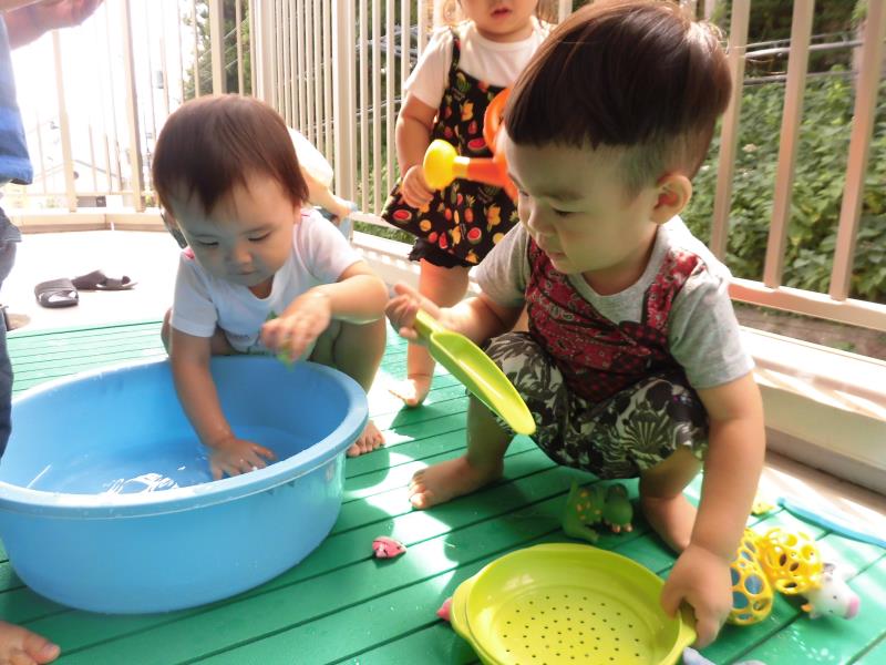 また、テラスでは水遊びをしました。じょうろの中にお水を入れて桶の中に出して遊んでいましたよ♪今日もとても暑い一日でしたので子ども達もとても気持ちよさそうでした!