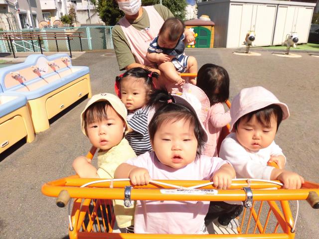 今日は天気も良く風が気持ち良かったですね!園庭に出て、自分の足で歩いたり、お散歩車に乗って外気浴をしました!