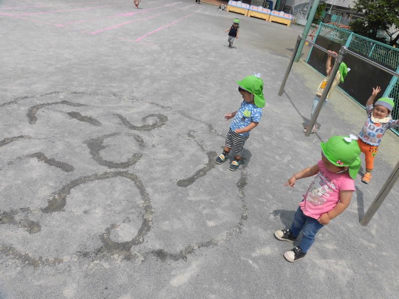 とても暑い一日でしたね(*'ω'*)!園庭に出てホースで水をまくと子ども達も近付き水浴びを楽しんだり、コップを持って来て'水を入れて~”と訴えている子ども達でした☺