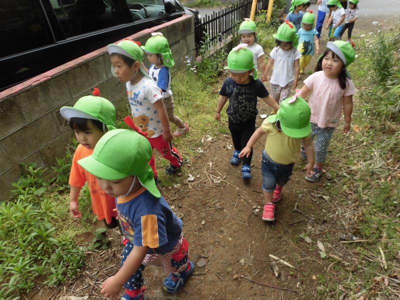お散歩中に虫や花を見つけて、興味深そうに見ていました。仲良く手をつないで、たくさん歩き、元気いっぱいに過ごしていました‼体の力がついてきたなぁと感じる一日でした‼