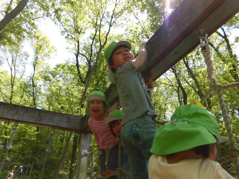 公園では、ブタやタコ、イタチにまたがったり、大型ジャングルジムに挑戦しているお友達が沢山いました。りす組のお友達は、「先生見て~」とジャングルジムを自信満々に登っていましたよ!!