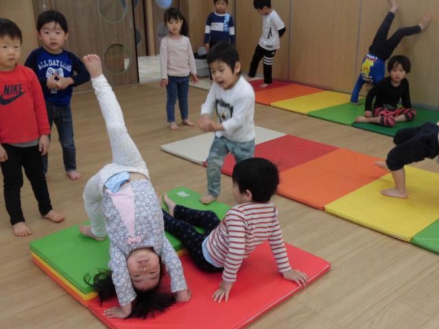 またぞう組さんのお友達さんが足の伸ばし方や手の付き方などを