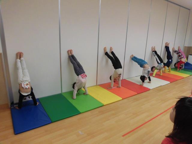 体操では全員で同時に壁逆立ちを行ない、誰が一番長く出来るか「壁逆立ちチャンピオン」を決めました☆
