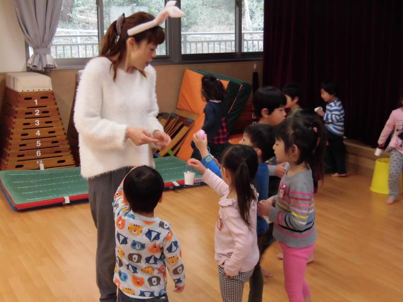 今日の英語指導は、イースターのお祝いをしました。岡田先生がホールに隠したEGGをみんなで「どこだ、どこだ!」と楽しそうに探し回っていました。みんなが見つけたEGGのお土産があるので、お家でも聞いてみて下さい。