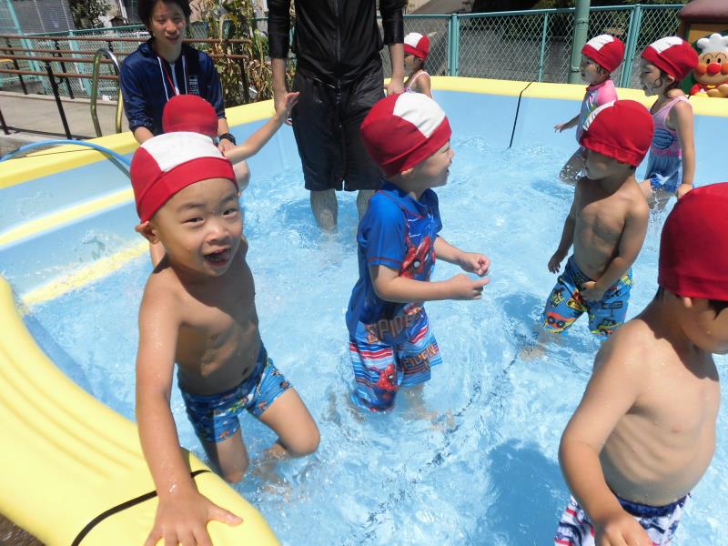 プールでは顔を水に直接つけてみたり、幼児組さんの真似をしてみました。あごだけつける子や、顔を付けられる子など様々な反応がありました!