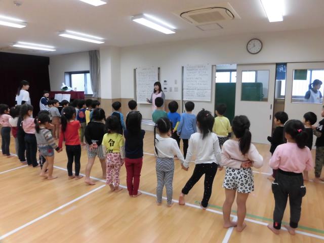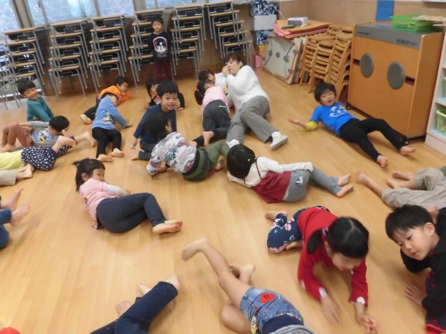 今日はとても寒い一日でしたね。鍵盤ハーモニカでは指を動かして吹けるように、手の甲におもちゃの果物を乗せて「落とさず吹こうゲーム!!」をしました。ゲーム感覚から鍵盤の指の動かし方が身に付くと良いです!!みんな集中して楽しんでいました♪