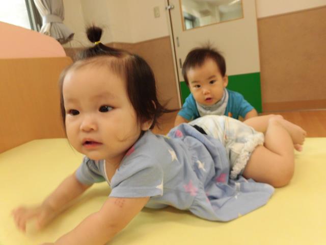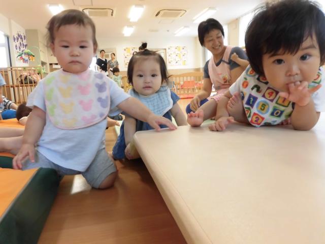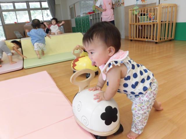 お部屋では2連のマット山を出しました。いつもよりも大きなマット山を見つけるとすぐに登り始めていました。アニマルカーは、乗るよりも押す子ども達。1・2・1・2と歩く練習をしていました。行えることがどんどん発達しています!!