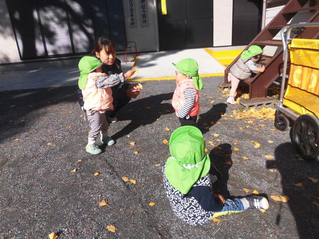 沢山のイチョウの葉っぱが落ちていて、かき集めてパッと周りに撒いて散らす遊びをするお友達や、踏んで感触を確かめるお友達など、遊び方は様々♪