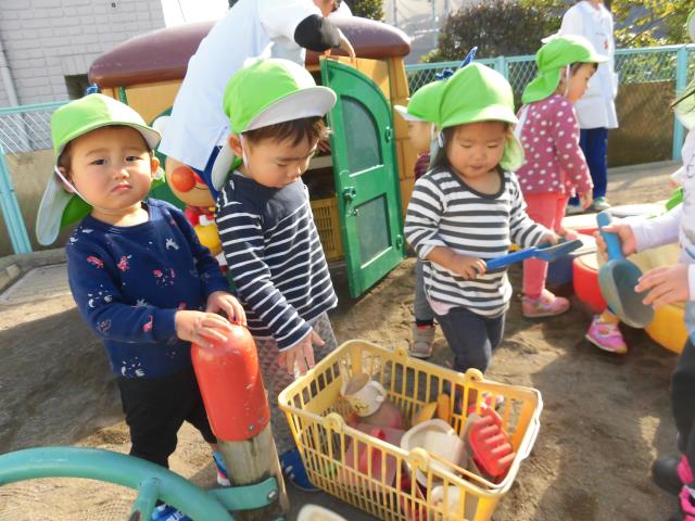 今日は園庭で遊びました!黄色い籠を覗き込んでどの玩具を使って遊ぼうか選びながらお砂場で遊んでいました(#^^#)