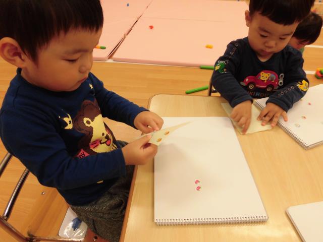 どちらもシール貼りを行ないましたが、保育者の見本を見て「ペタッ!」と言いながら楽しんでシールを貼っていましたよ!