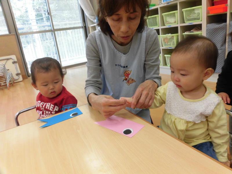 こいのぼり製作では保育者がシールの裏紙をはがすとベタベタする感触に不思議そうな顔をしながらも指先を使って上手にシール貼が出来ました♥