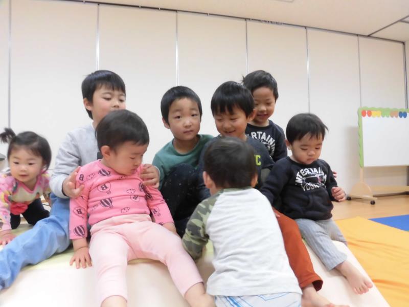 今日は、お部屋で遊びました。レインボーマットやエバーマットにゴローンと寝っ転がって遊んでいる子、マットによじ登って楽しんでいる子様々・・・立てる子は、動物の車に乗っていました。お友達同士の関わりも少し出てきましたよ。