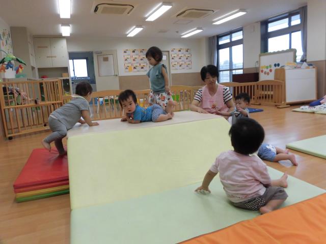 今日は、室内でマット山や動物の乗り物を出して遊びました(^^♪