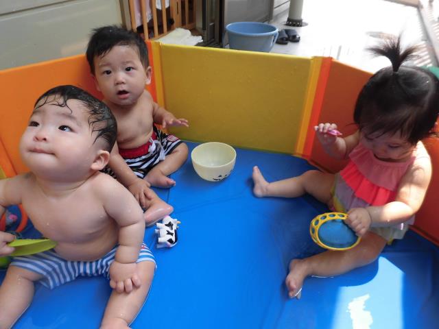 水に触れることに大分慣れました!自分からプール遊びが行なわれているテラスへ向かうお友達もいます。