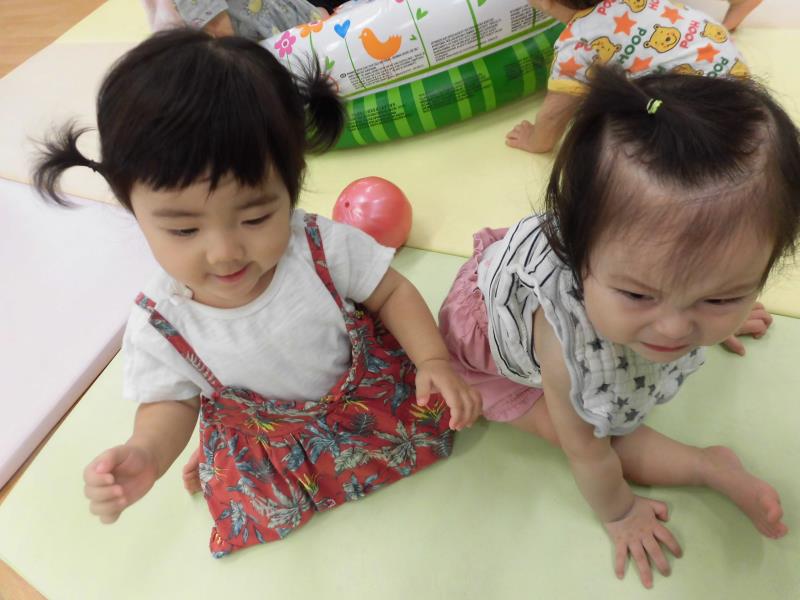 お部屋にビニールプールを置き、中にボールを入れて遊びました。自分で中に入ったり、ボールを出してみたりと、楽しんでいました!