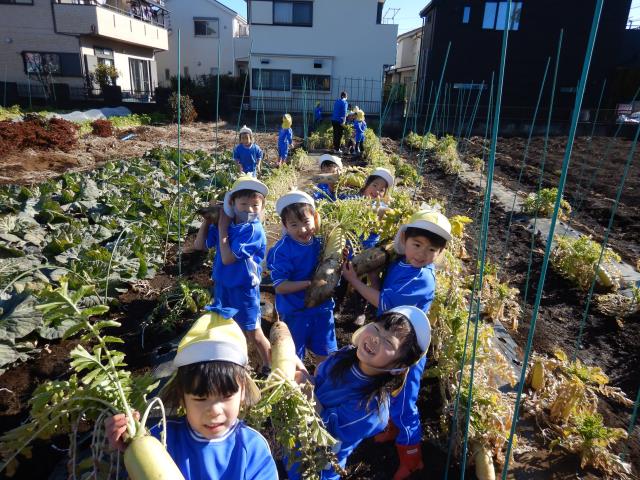 畑に着くと元気よくご挨拶をし、宮鍋さんとのお約束を守りながらたくさん大根を抜きました!!立派な大根に「重たい!」と幸せそうな笑顔を見せてくれました☺
