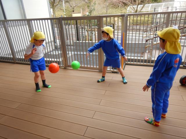 少人数での鍵盤、ワーク、体操を集中して行なった後、ドリームガーデンで思い思いに遊びました。ボールが外に出てしまうので高く投げないという約束をしっかり守りつつ、保育者とのラリーに燃える子ども達です!!