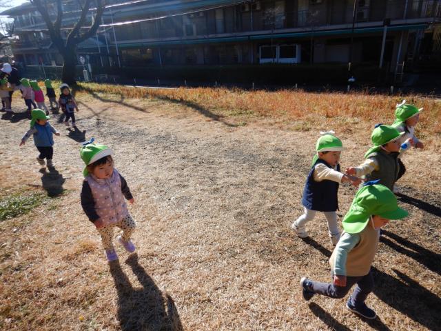 北風が冷たかったですが、子ども達は元気いっぱいです!!あひる組は、道路沿いにある原っぱへお散歩に行きました。