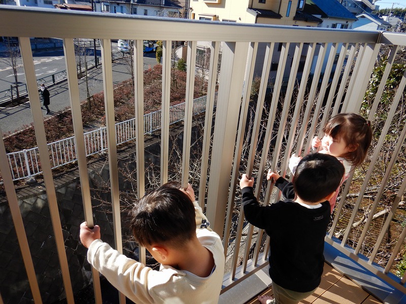 テラス遊びをしました。目の前が道路なので、行きかう人や車、バス等に「おーい。」と手を振っていました。手を振り返してもらえるとニッコリ嬉しそうです。とても暖かかったので、テラスにゴロンと横になったり座ってひなたぼっこをしていました。