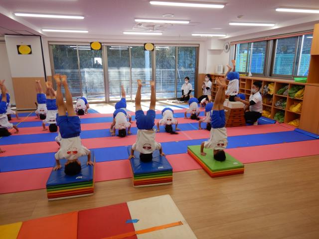 体育指導では久しぶりに会う落合先生に挨拶をし、側転やブリッジ歩き、逆立ちなど基本的なことを拘って行ないました。