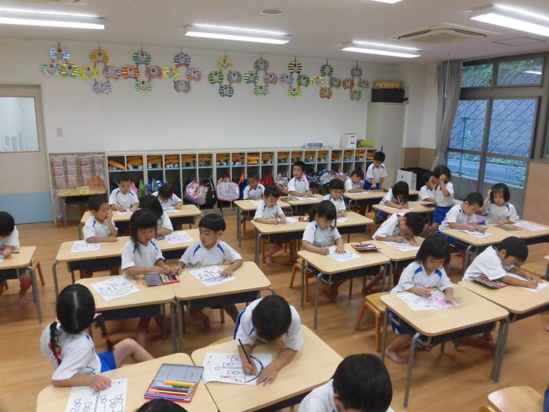そして雨が上がりますように・・・と、てるてる坊主のぬりえをしました。飾るとお部屋がとってもカラフルに♡雨でじめじめしますが、なんだか子供達の力でお部屋がハッピーになりました。子供達の想い空まで届きますように・・・ 清水