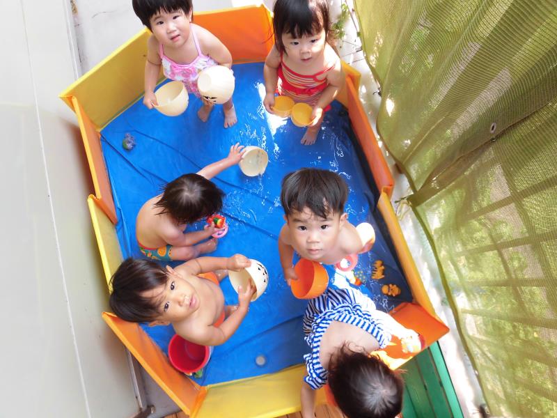 子ども達はプールに入り気持ちよさそうに遊んでいました!1人でジョウロで遊ぶ子ども、カップにお水を入れてお友達と掛け合う子もいました(^-^)