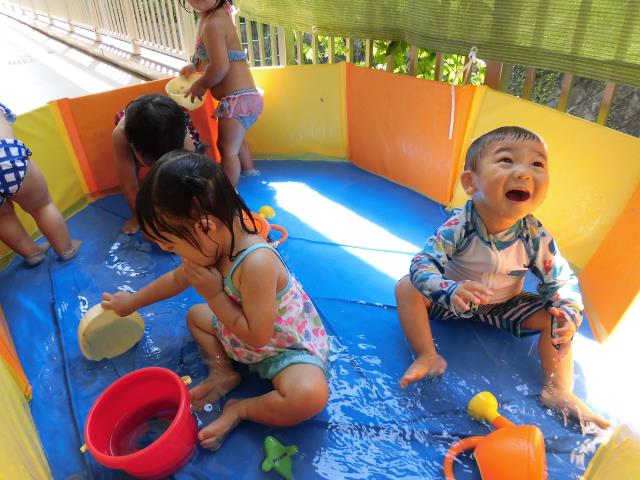 お友達同士でお水をかけあったり、プールの外にお水を出したりなど、好きなようにたくさん遊んでいました!