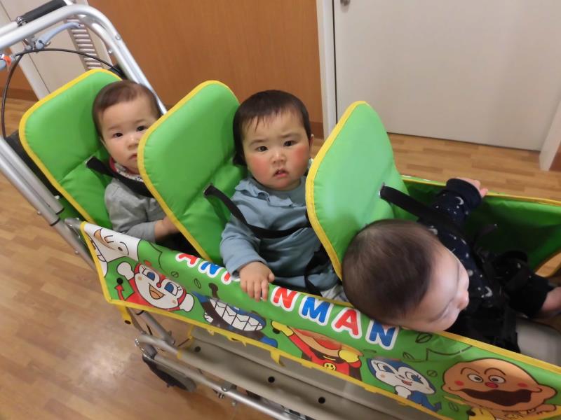 園内散歩に行き、アンパンマンバギーに乗ると嬉しそうにしていました(^^♪