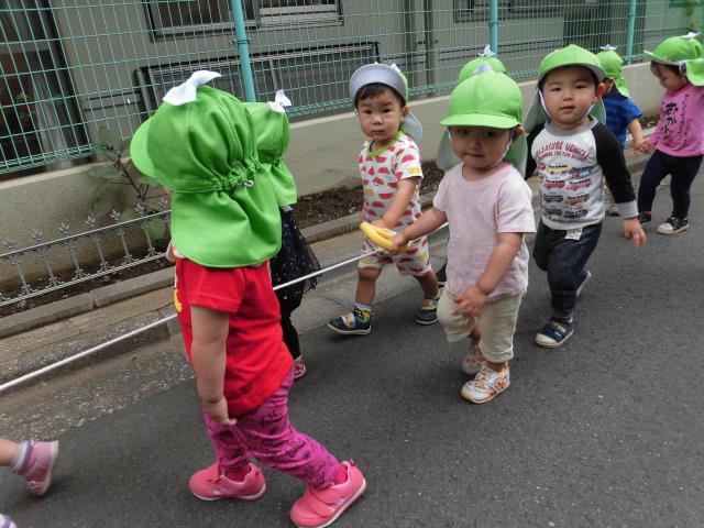 お散歩ごっこもロープを出すと私も僕もという感じで掴まり上手に歩いていました。みんなで外のお散歩に行くのが楽しみです。