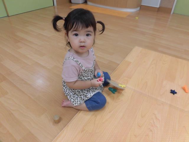 今日は型はめや積み木、シール貼り、アイクリップをしました。手先を使って集中して遊んでいましたよ。クリップではギュッと指先に力を入れて、はさむ時に手からポロリと落としながらも、諦めらめずに集中する姿、すごいなーっと感心しました。