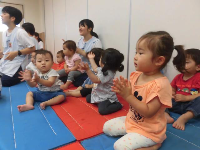 6月生まれのお友達のお誕生日会がありました(*^-^*)舞台の上ではペンダントを首からかけ嬉しそうなお友達✨あひる白組は手を叩きましょうを青組は時計のうたをプレゼント!毎日保育園でうたっている歌なので子供達も舞台の上でノリノリでうたったり踊っているお友達もいましたよ(^^)/「おめでとう!」と言葉で伝えるお友達もいました!お友達をお祝いする姿とても素敵です(^-^)