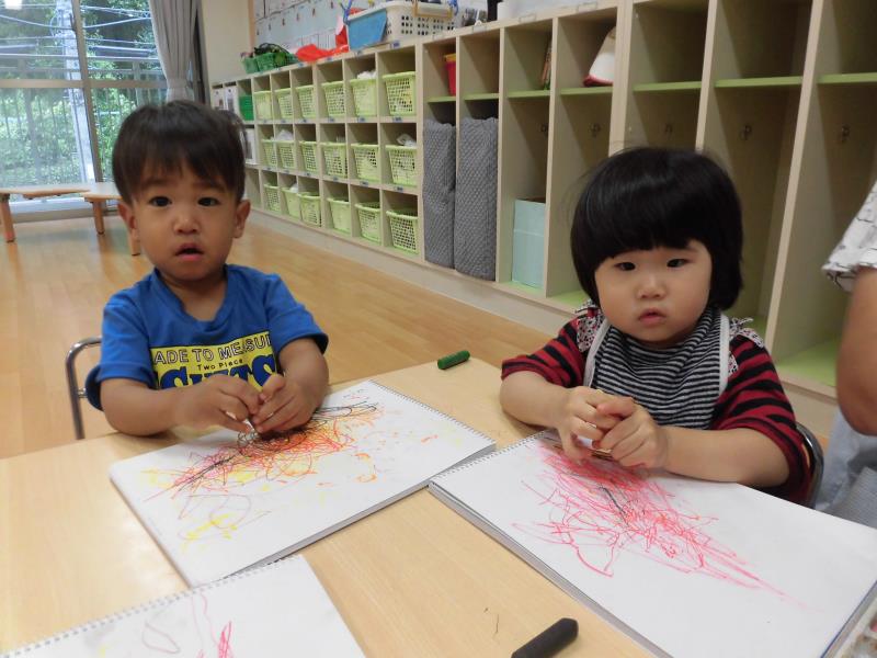 クレヨンを持つと子供達はニコニコ笑顔になりとても楽しそうでした!色が出る事が嬉しくて沢山お絵描きが出来ましたよ!!